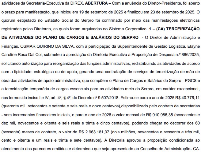 Constando no site: Ata da 45ª Reunião Extraordinária da Direx - https://www.transparencia.serpro.gov.br/acesso-a-informacao/atas-de-reuniao/atas-2025/diretoria/ata-45a-rde-de-19-09-2025.pdf